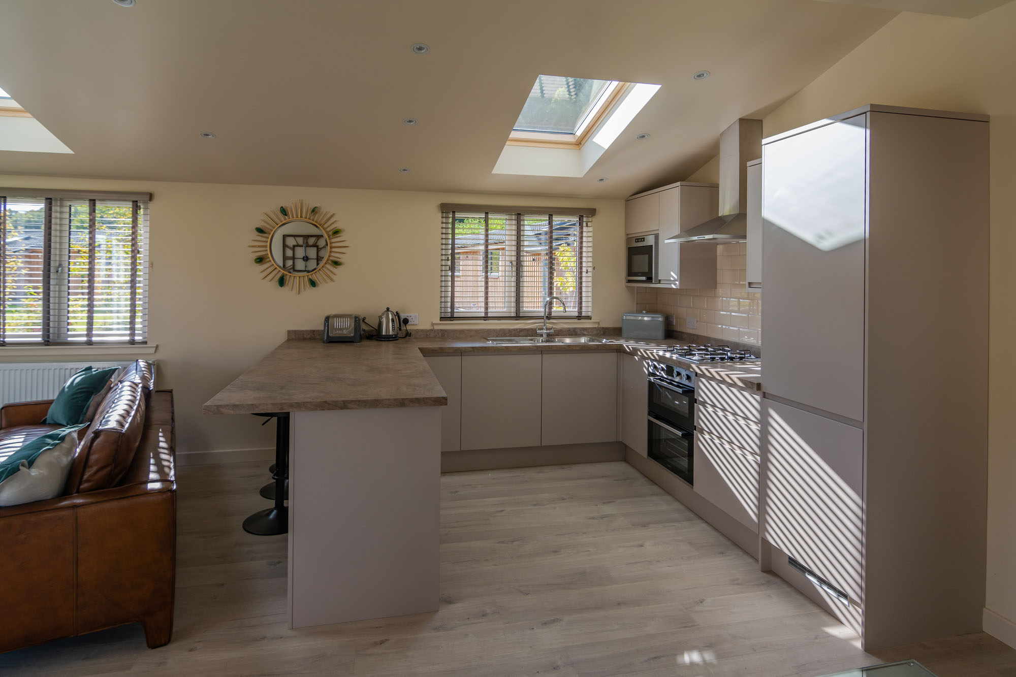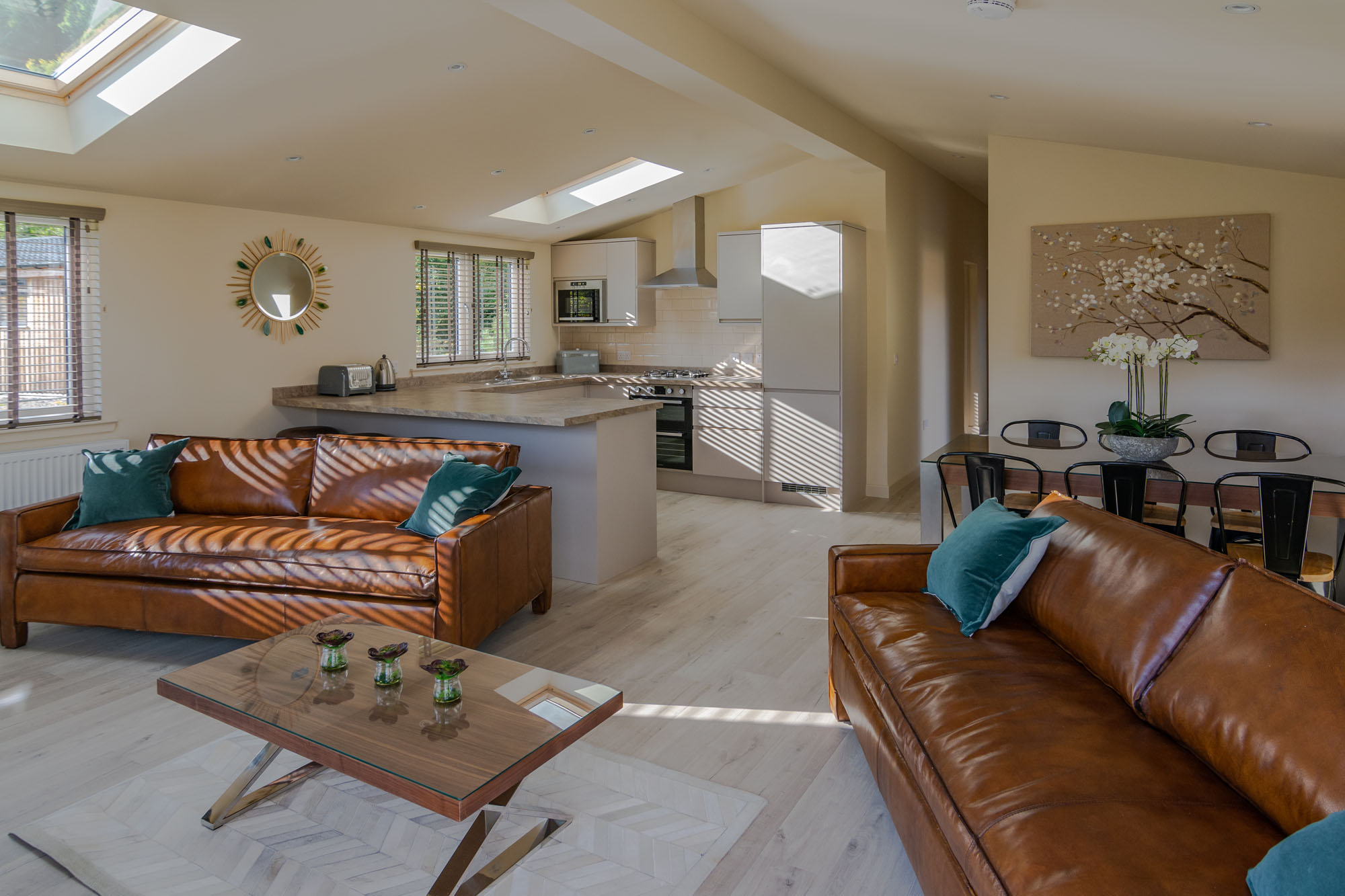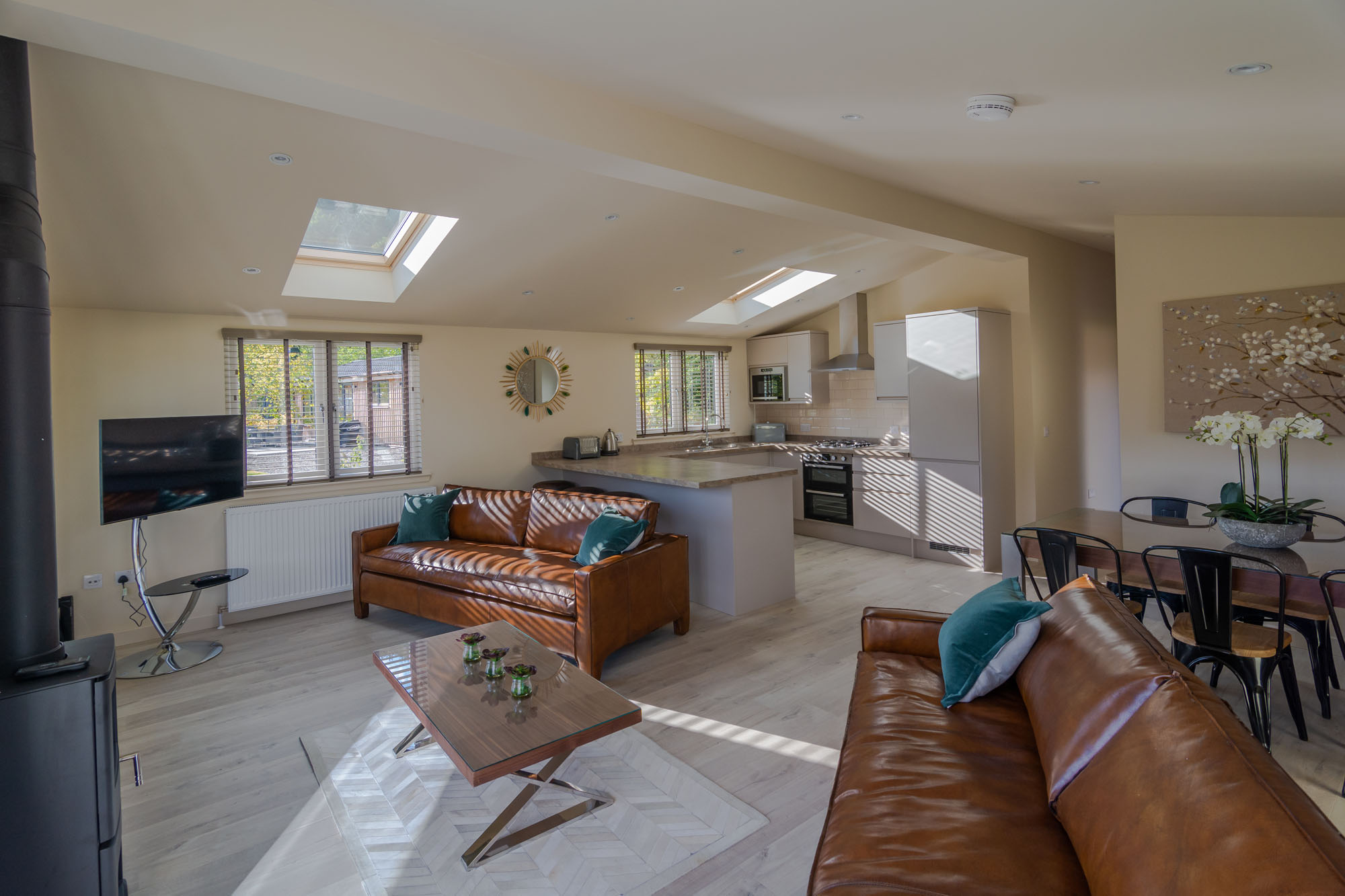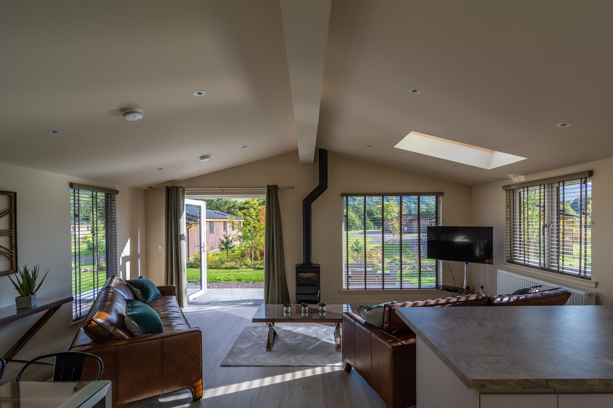 Beautifully furnished throughout Rowan Lodge comprises open plan lounge/kitchen/dining area and boasts gorgeous natural wood bespoke furniture.