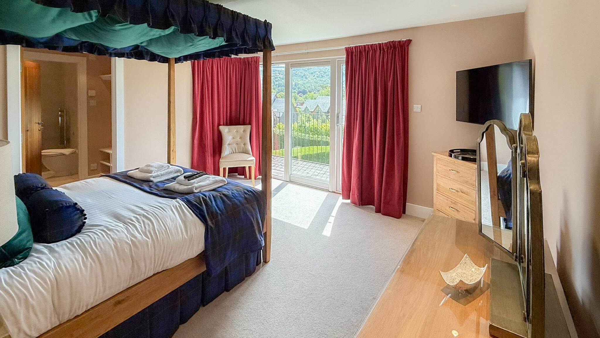 A final stylish bedroom with a luxurious four poster bed with dressing room and ensuite bath with overhead shower, patio doors lead out to a balcony.