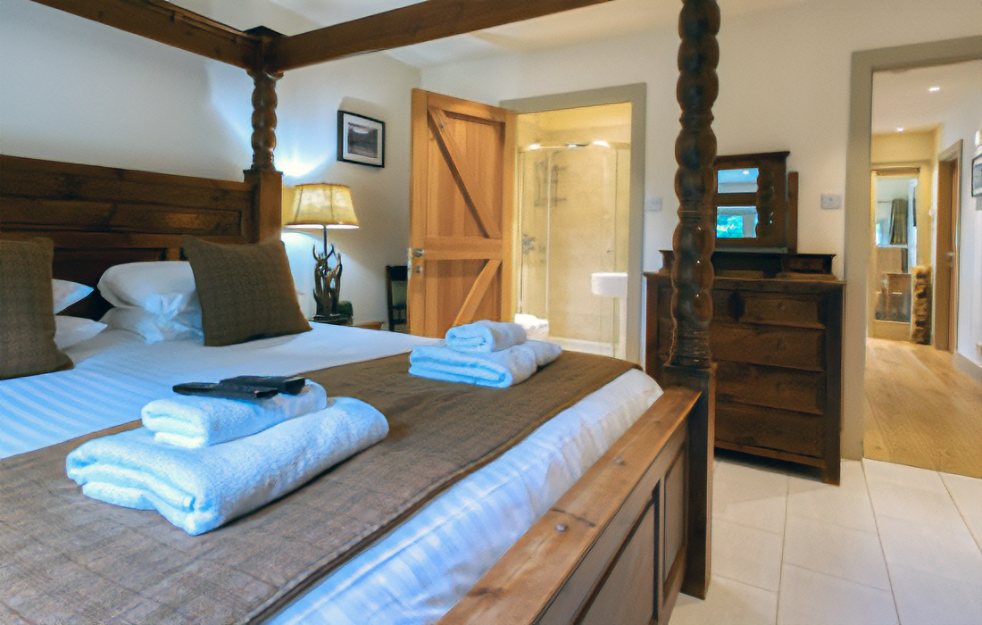 1 x 4 poster en-suite bedroom & 2 x en-suite bedrooms (super king or twin). Bookings from any day arrival for a minimum 3 night stay.