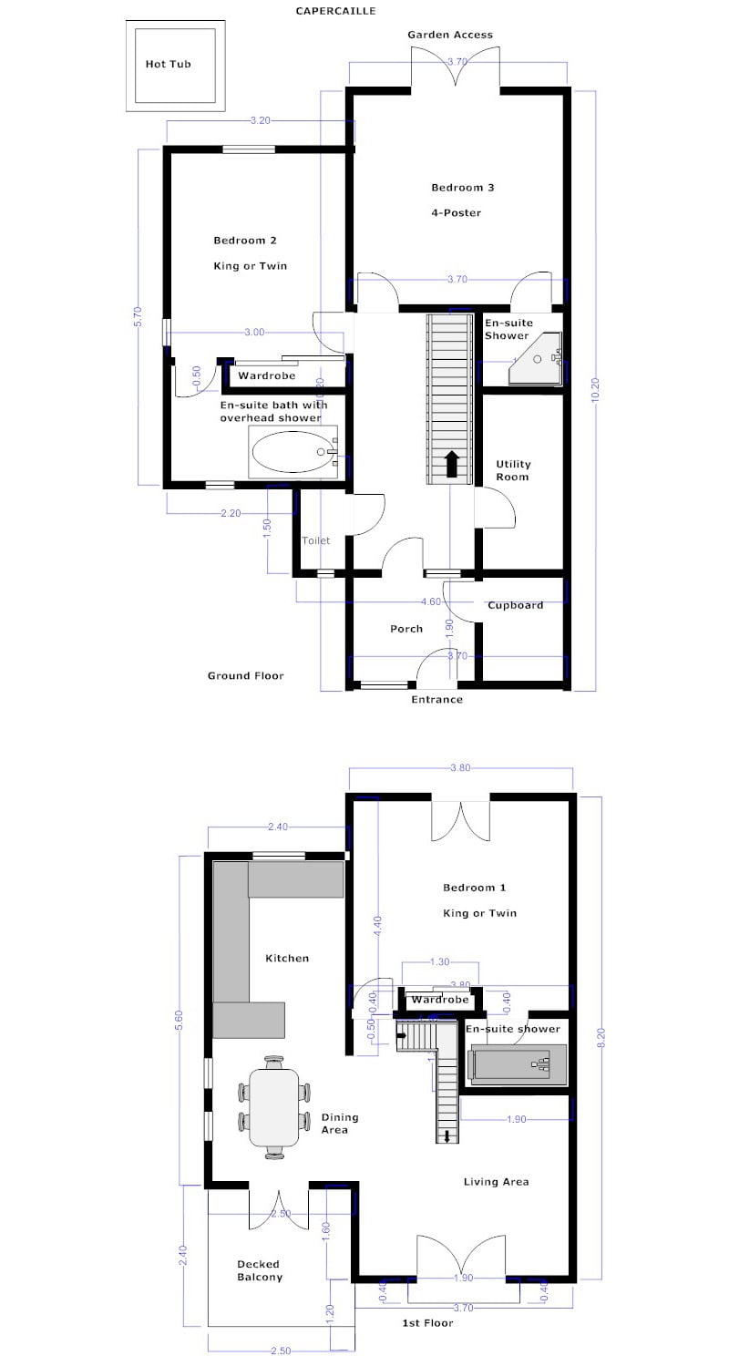 Magnificent 4 poster superking bed with ensuite shower room, access to a private enclosed garden with gazebo covered hot tub is through patio doors. A further bedroom with zip & link beds with an ensuite bath/shower room.