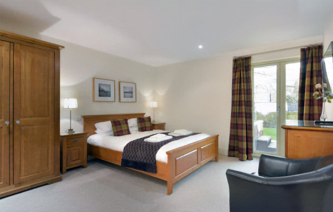 Beautiful bedroom complete with ensuite shower room and zip & link beds, access to a private garden with hot tub is through patio doors. A further bedroom with zip & link beds with an ensuite bath/shower room.