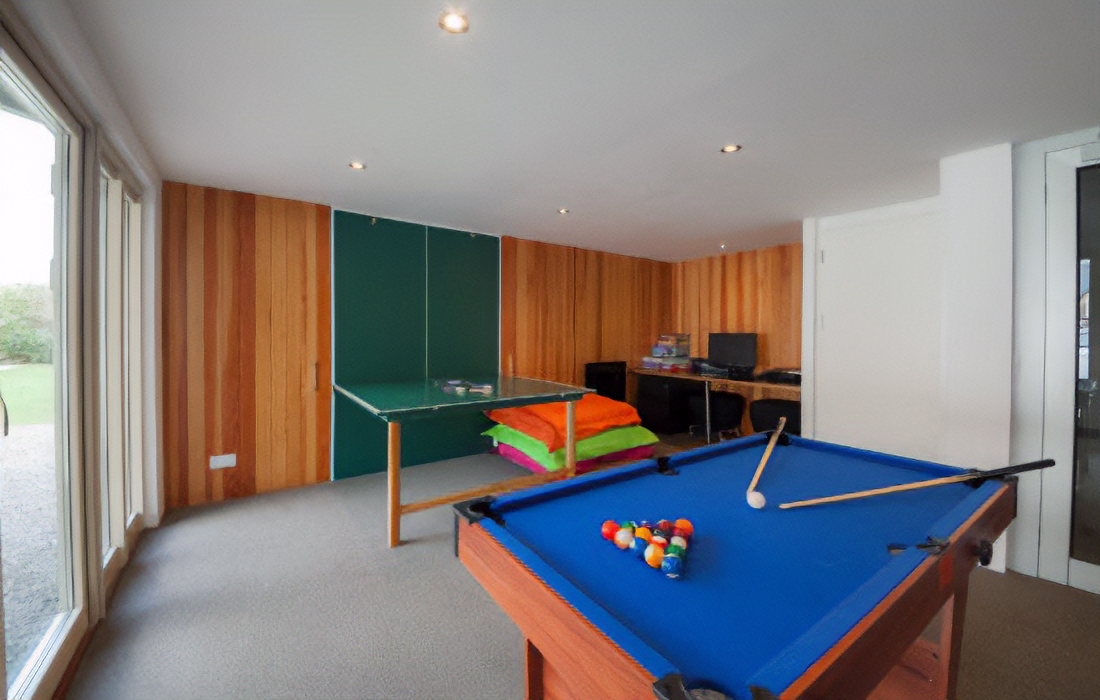 A large games room with a pool table, table tennis and PlayStation. This property has a glass elevator to the first floor.