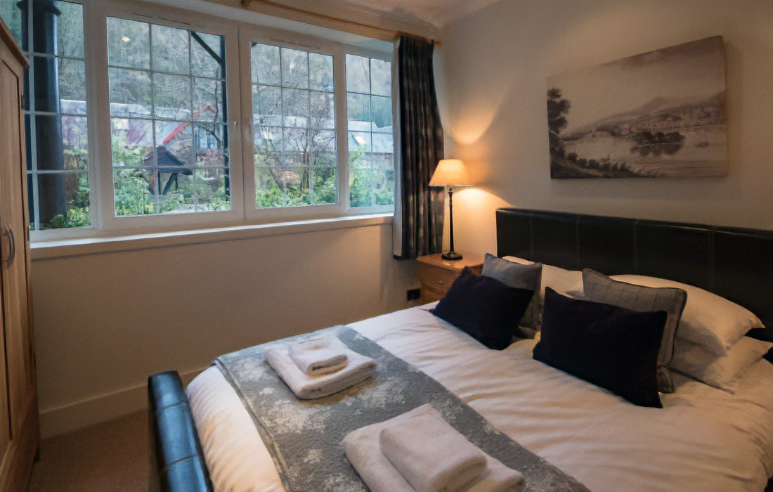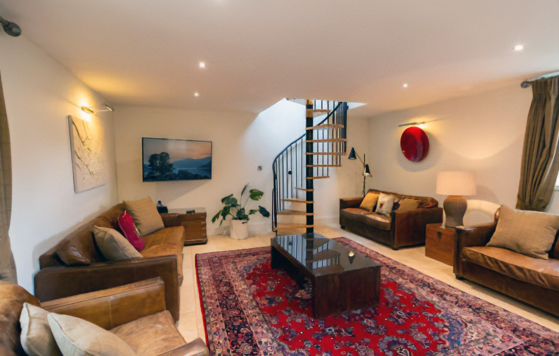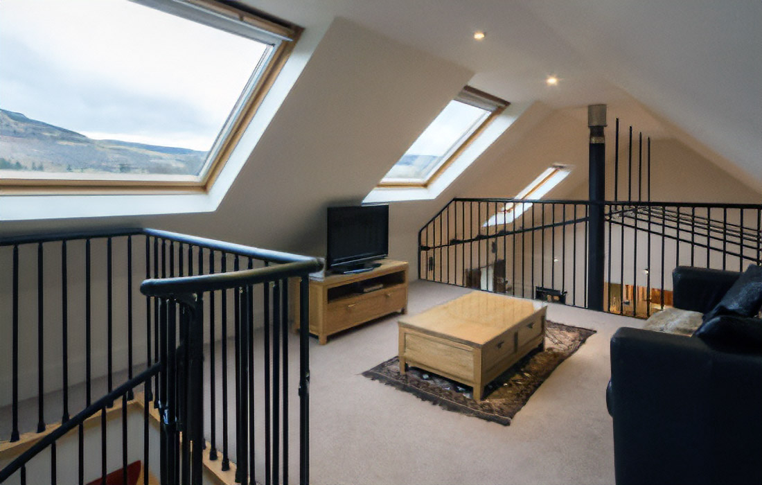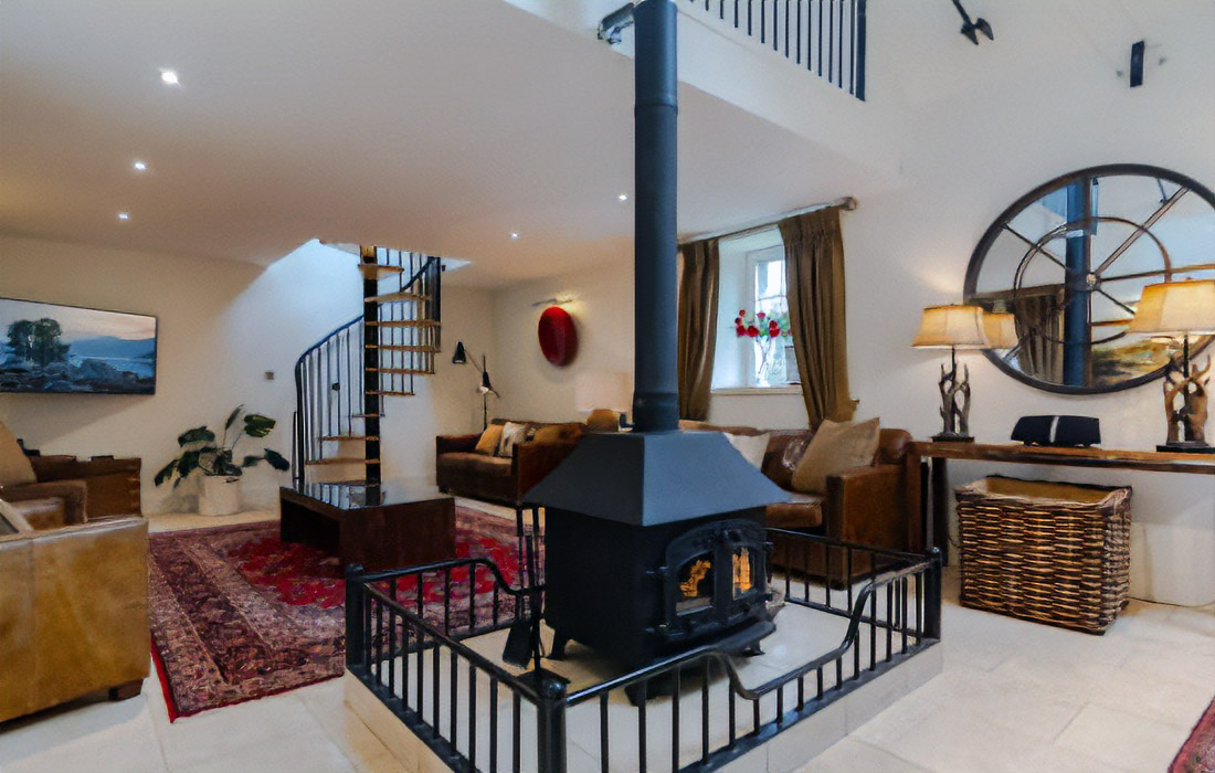 Extensive lounge and dining area elegantly furnished with sumptuous leather sofas and tiled throughout. The dining table which converts to a pool table and the central feature is a fabulous back-to-back wood burning stove. A spiral staircase leads to a mezzanine level lounge with Wii games console and spectacular views of the loch and mountains. Underfloor heating.