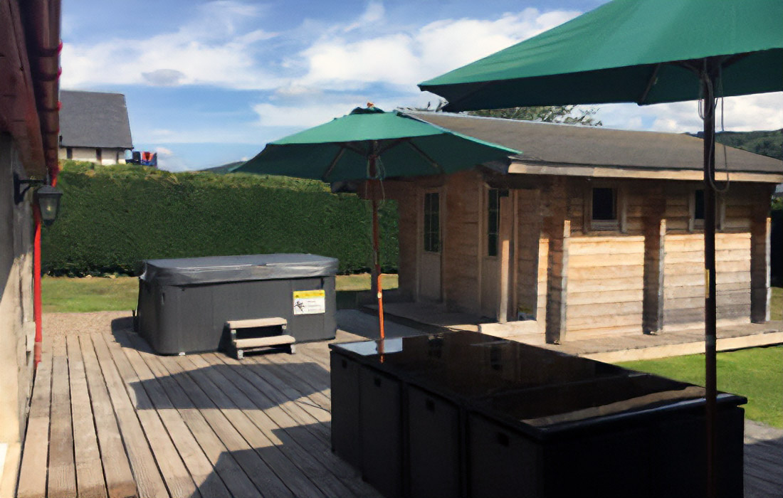 Extensive private garden grounds with patio area, Finnish sauna chalet, hot tub, gas BBQ (seasonal) and patio furniture.