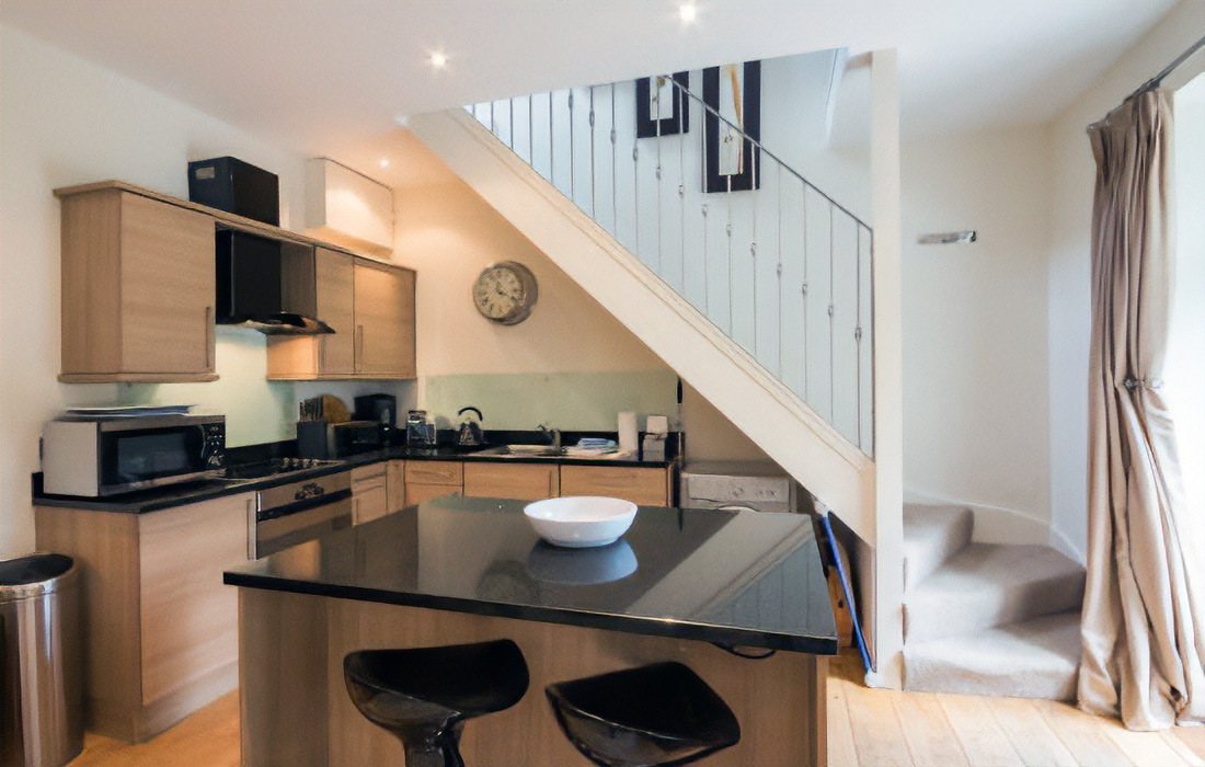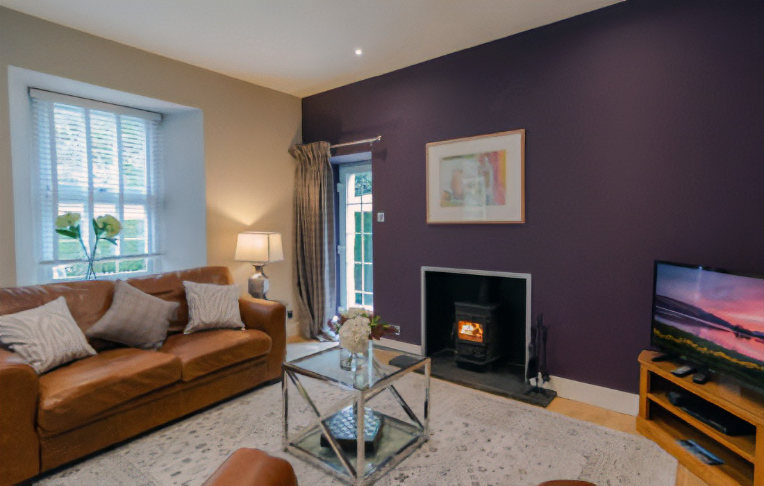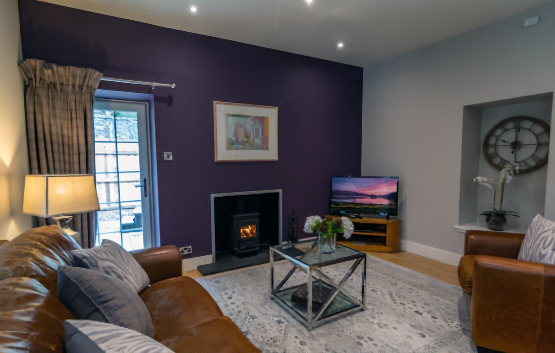 Cosy open plan lounge/dining/kitchen with breakfast bar with gourmet kitchen with granite work surfaces. Wood-burning stove. French door leading to the enclosed patio with private hot tub. Leather sofa, oak flooring with designer furnishings.