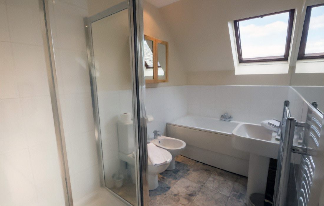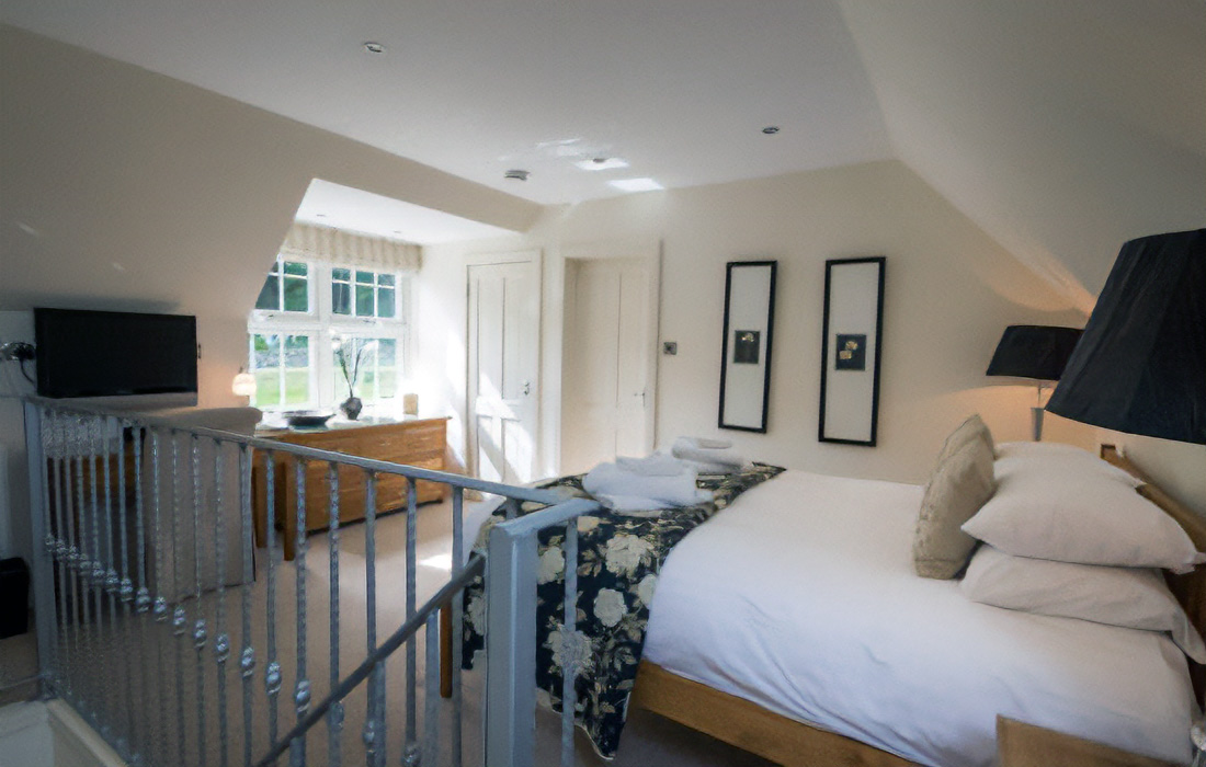 Elegant and luxuriously furnished galleried area with king-size bed. Stylish bathroom with separate bath and shower with body jets, and under floor heating. Dimmer lights throughout.