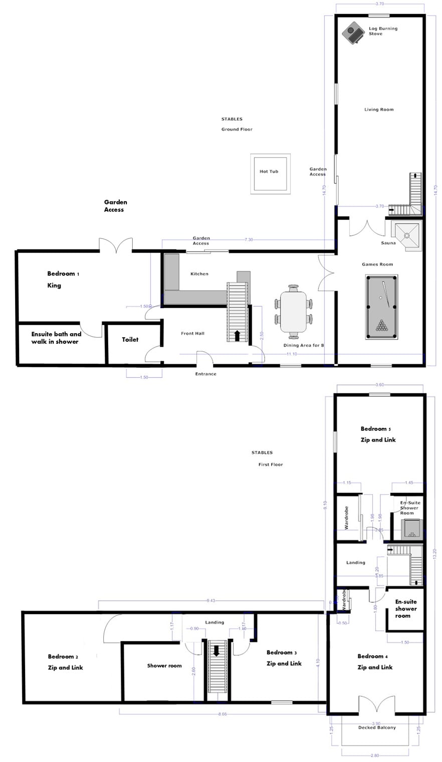 Open plan staircase accessed from the main living room leads to two beamed master bedrooms with zip and link beds (both with ensuite shower rooms), one of the bedrooms having a small balcony overlooking the pretty courtyard. Two further bedrooms with zip and link beds accessed from the front hall and share use of a standalone shower room.