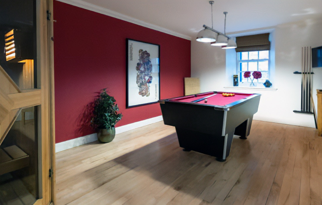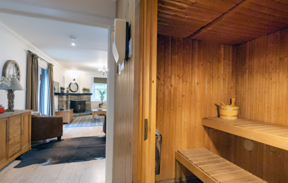 Ground floor king bedroom with access to the garden and modern ensuite bathroom comprising separate bath and walk in shower. Main lounge features a stone fireplace with wood burning stove, multi-channel TV and patio door to the garden. Games room with pool table and sauna. Farmhouse-style L-shaped dining kitchen overlooking the garden. Separate WC.