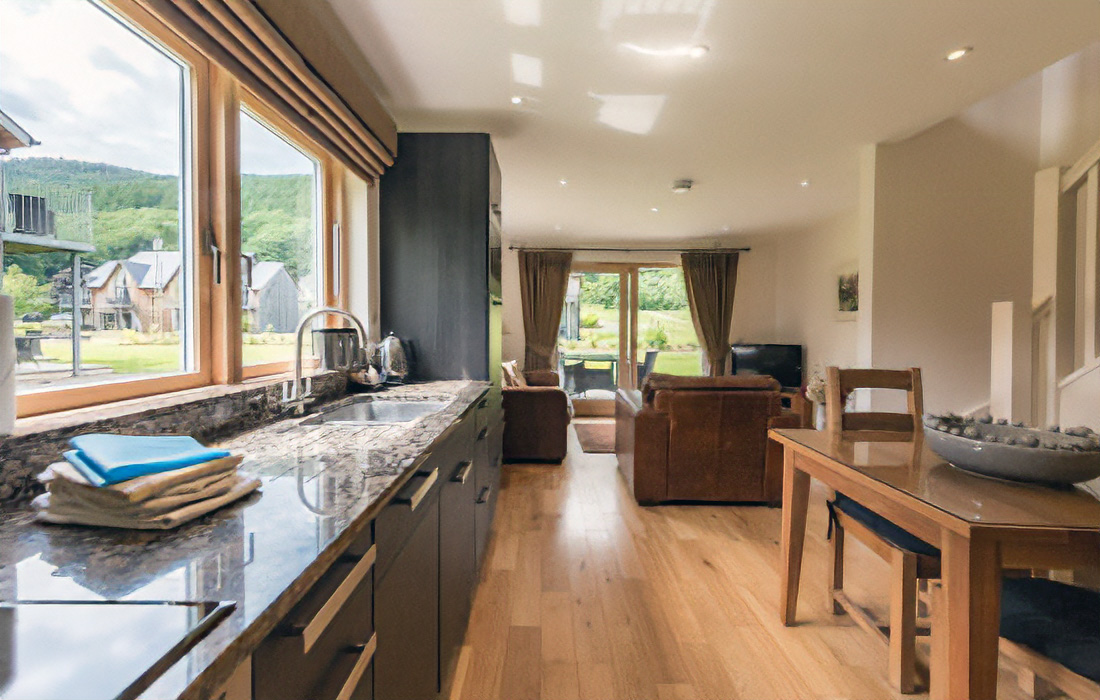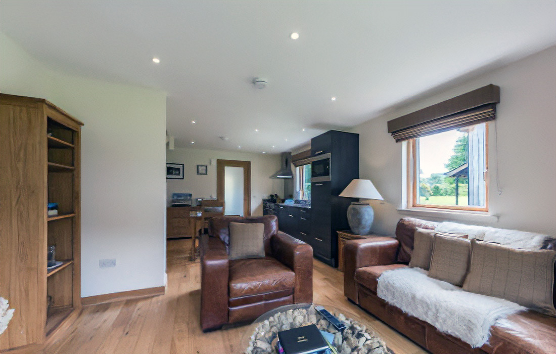 Contemporary open-plan lounge/dining/kitchen area sumptuously furnished in leather and oak.