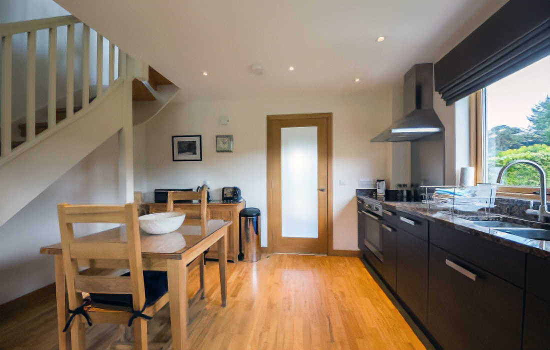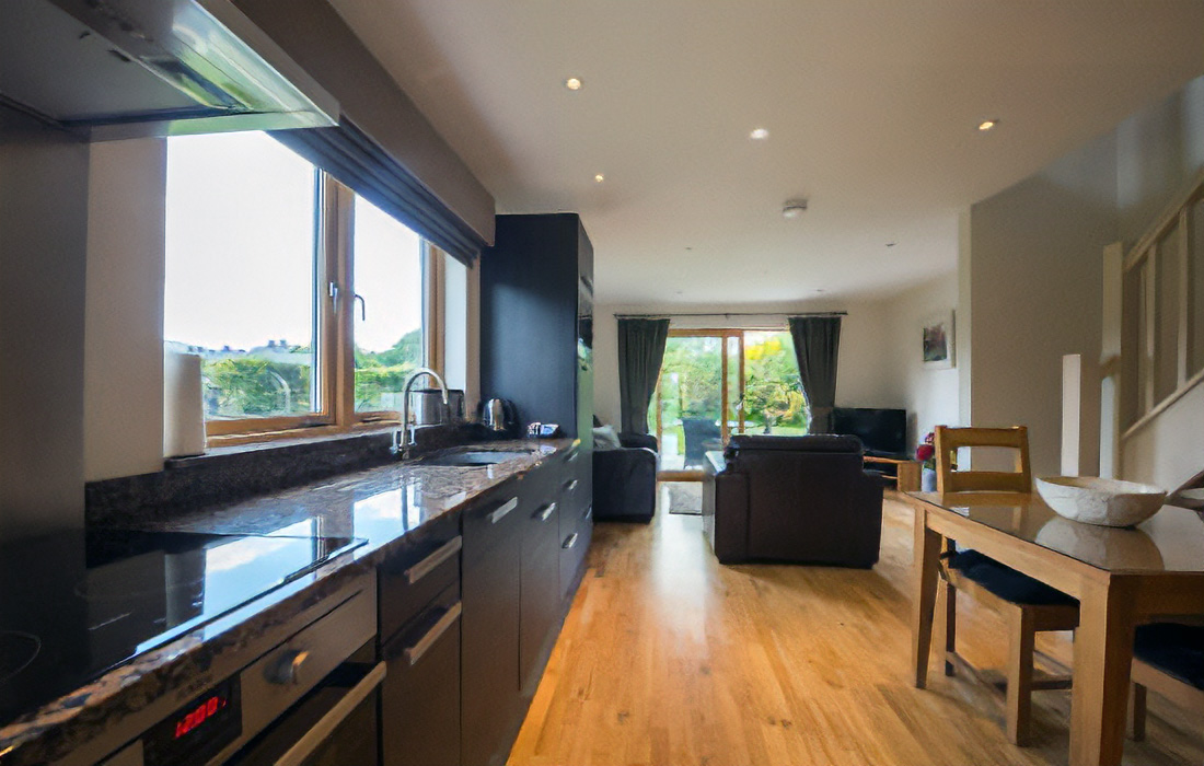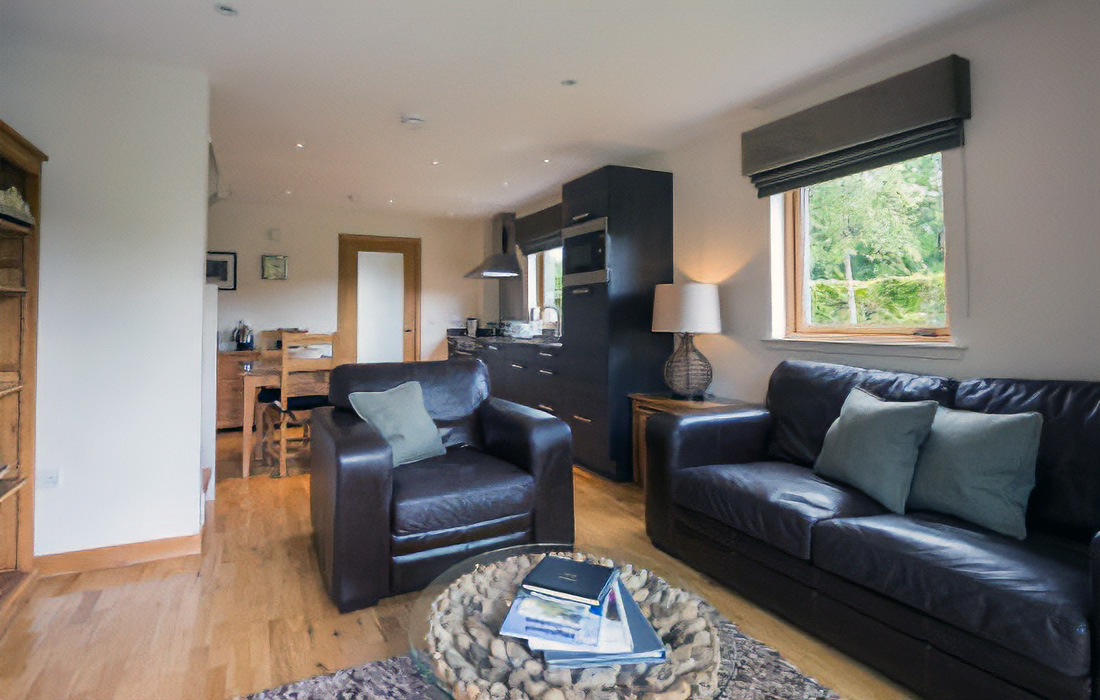 Contemporary open-plan lounge/dining/kitchen area sumptuously furnished in leather and oak.