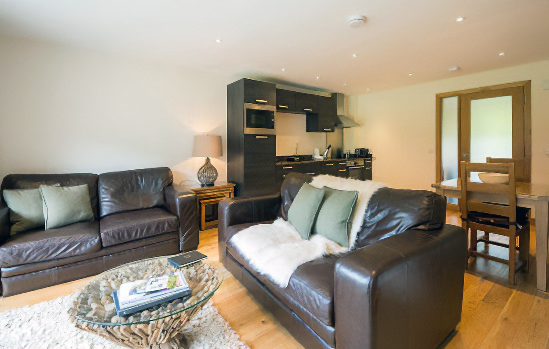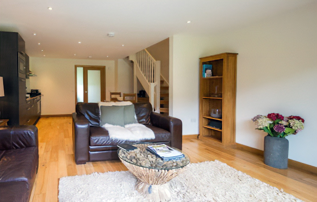 Contemporary open-plan lounge/dining/kitchen area sumptuously furnished in leather and oak.