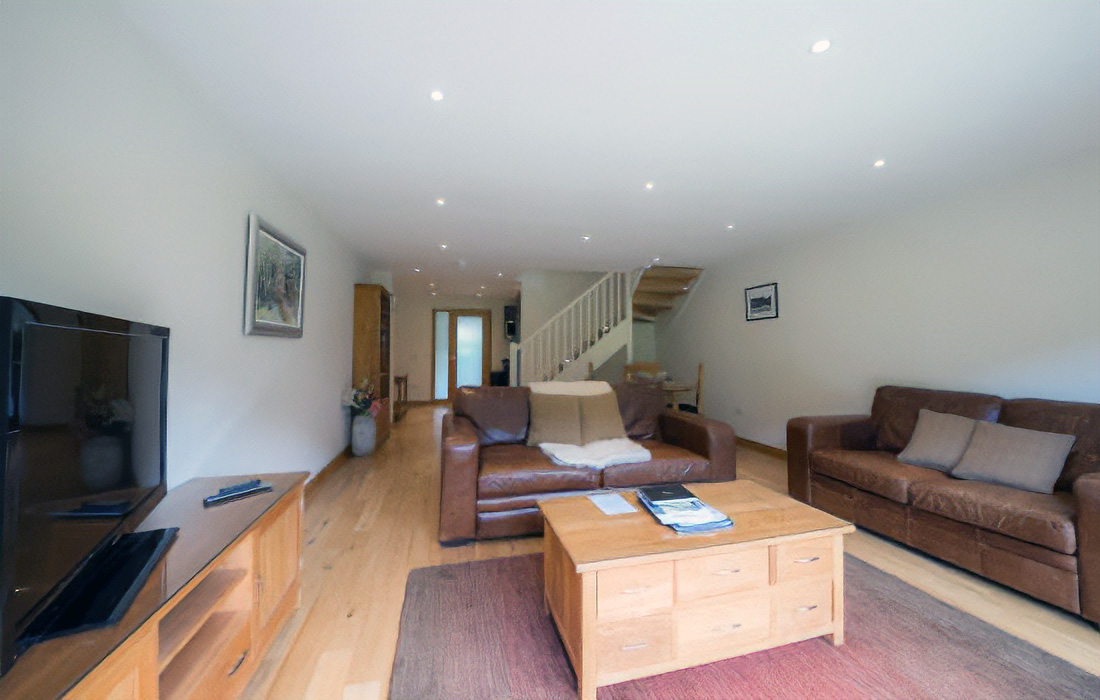 Contemporary open-plan lounge/dining/kitchen area sumptuously furnished in leather and oak.