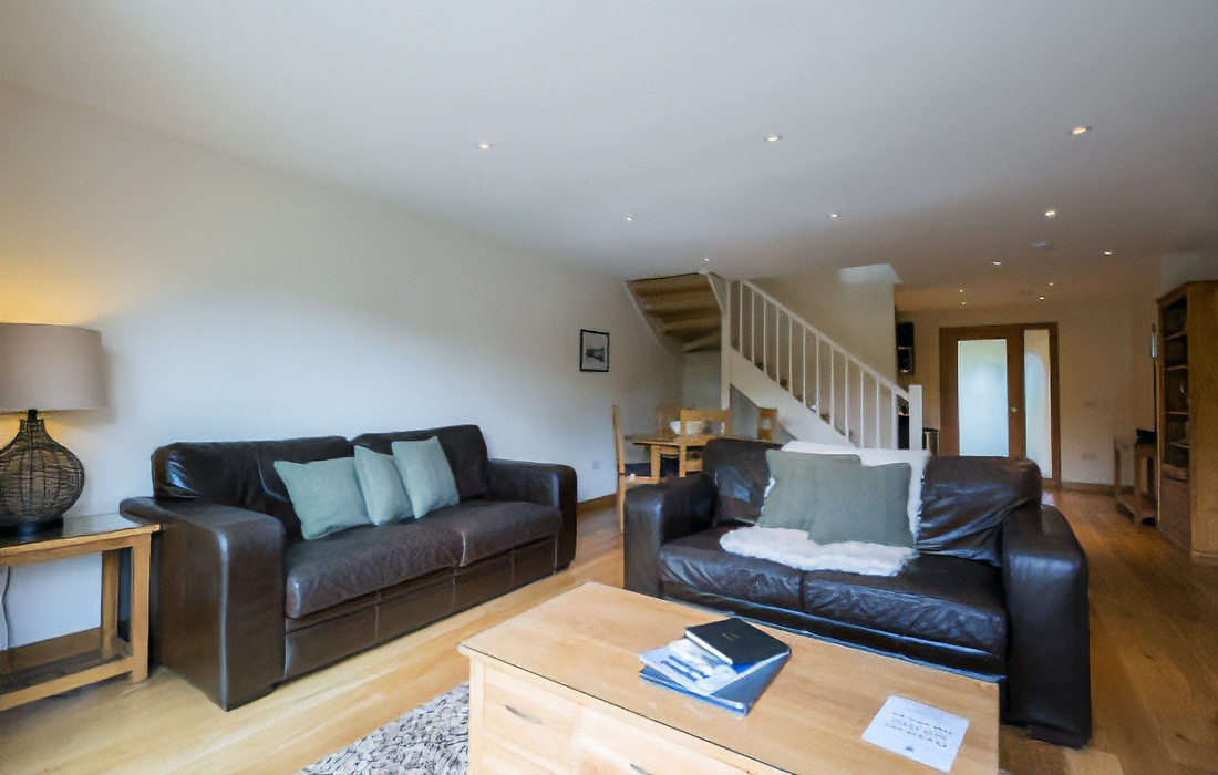 Contemporary open-plan lounge/dining/kitchen area sumptuously furnished in leather and oak.