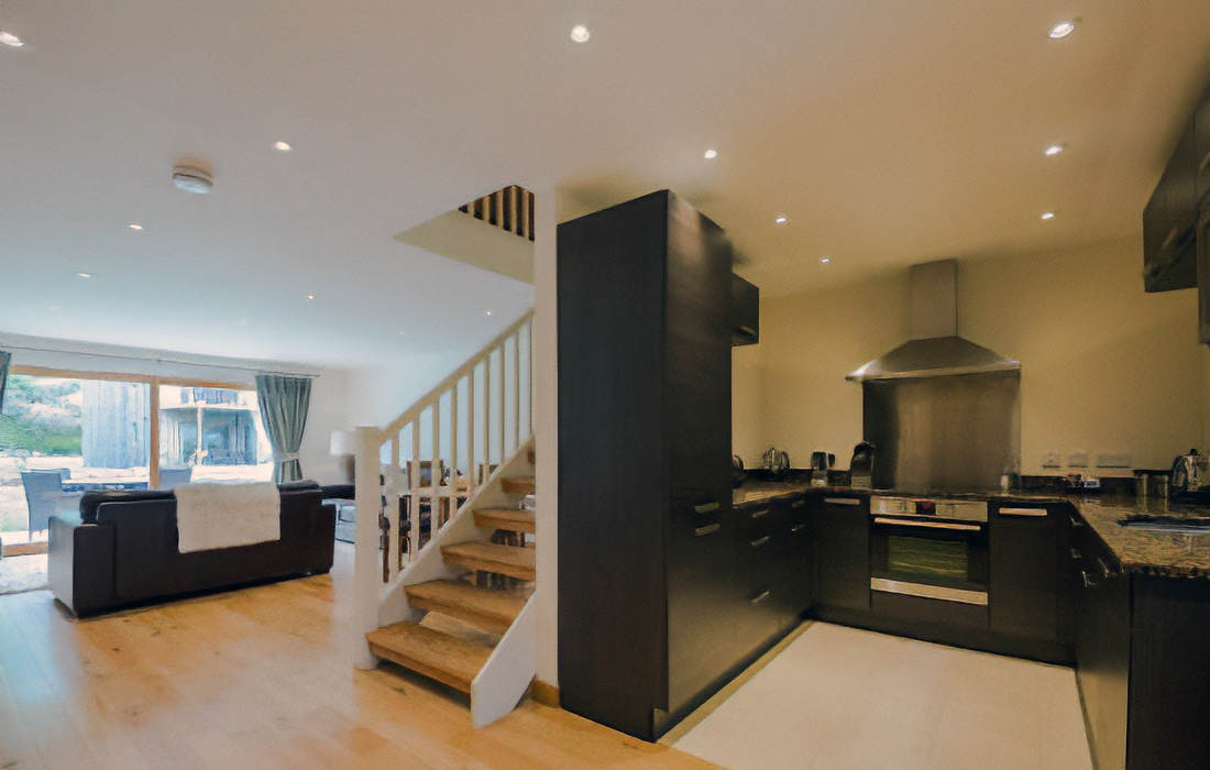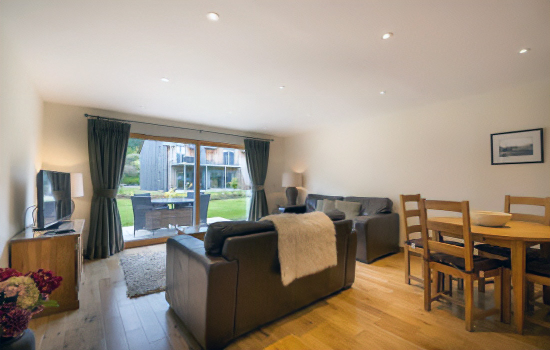 Contemporary open-plan lounge/dining/kitchen area sumptuously furnished in leather and oak.