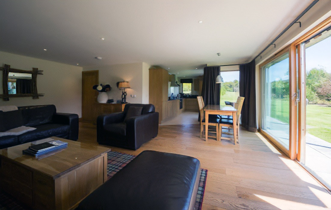 Contemporary open-plan lounge/dining/kitchen area sumptuously furnished in leather and oak.