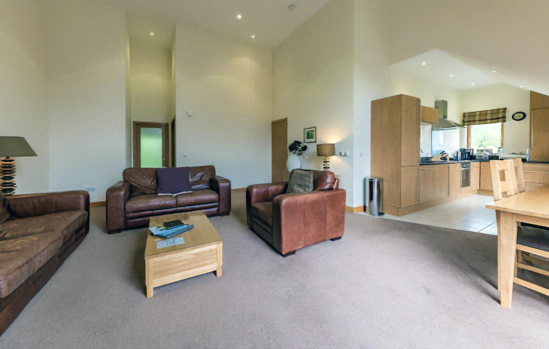 Contemporary open-plan lounge/dining/kitchen area sumptuously furnished in leather and oak.