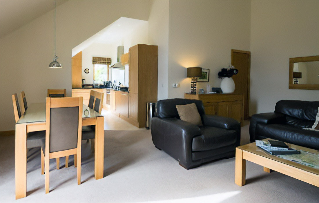 Contemporary open-plan lounge/dining/kitchen area sumptuously furnished in leather and oak.